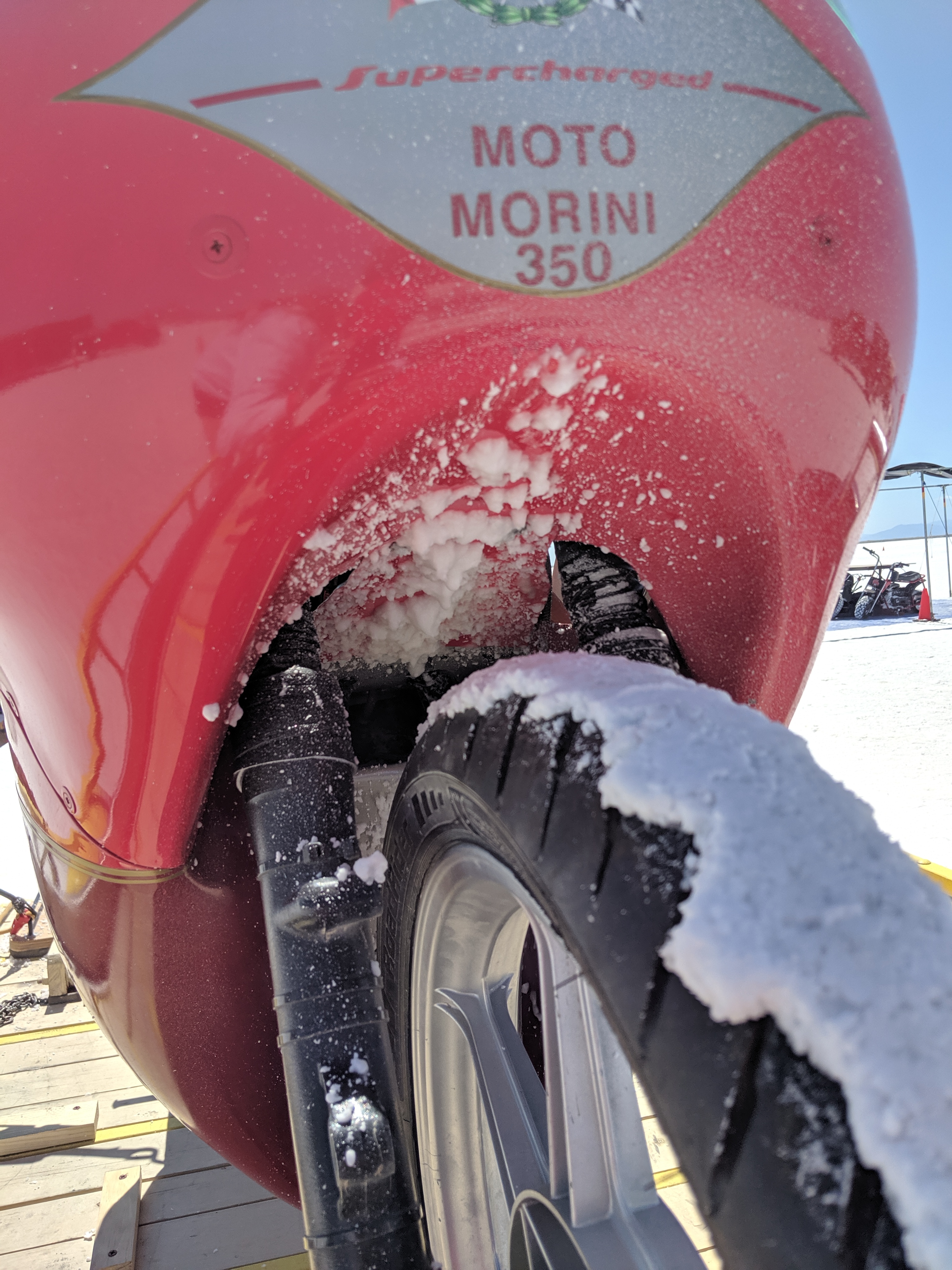 The salt build-up on the tires was significant! It was a good thing we chose to remove the front fender so the salt wouldn’t lock the front wheel. The Red Baron threw a salty “rooster tail” during the turn-off that splattered a salt stripe which needed to be cleaned before the next run on the long course!